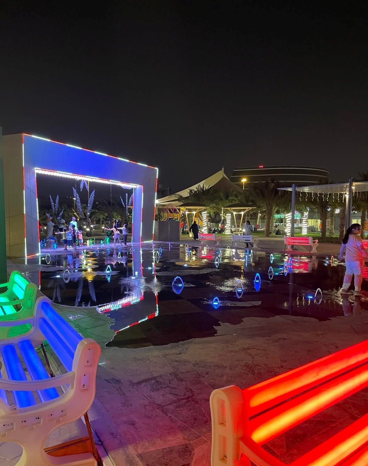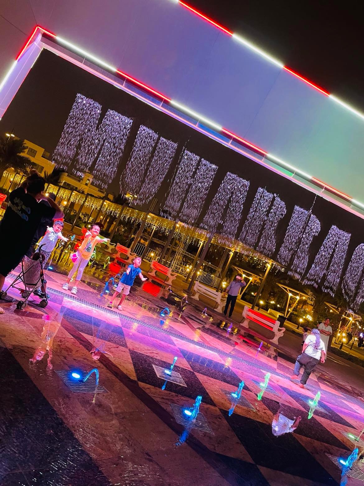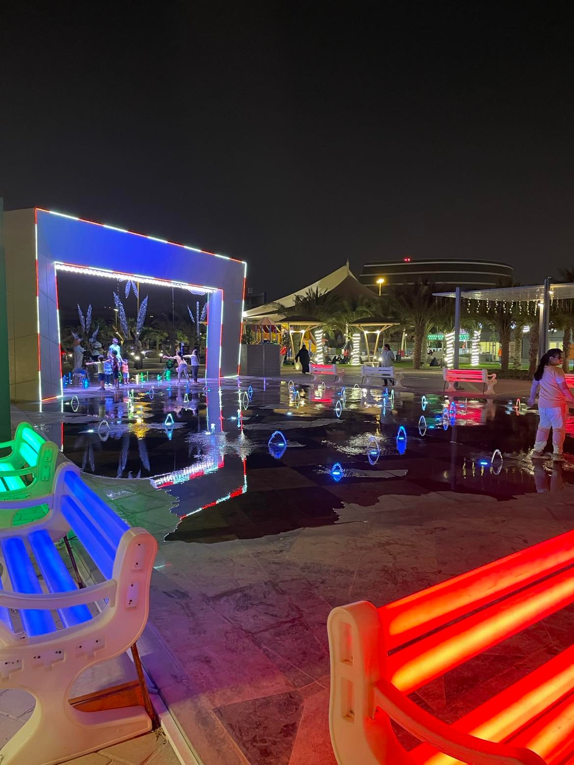 But then, you can just walk around, enjoy the free sight and let your kids play in the fountain- which I liked the most, with the word “Muharraq Garden” and some stars and other shapes made of water that attractively falls in the middle of the fountain that looks enticing to me while I sit on the luminous benches in different colors.