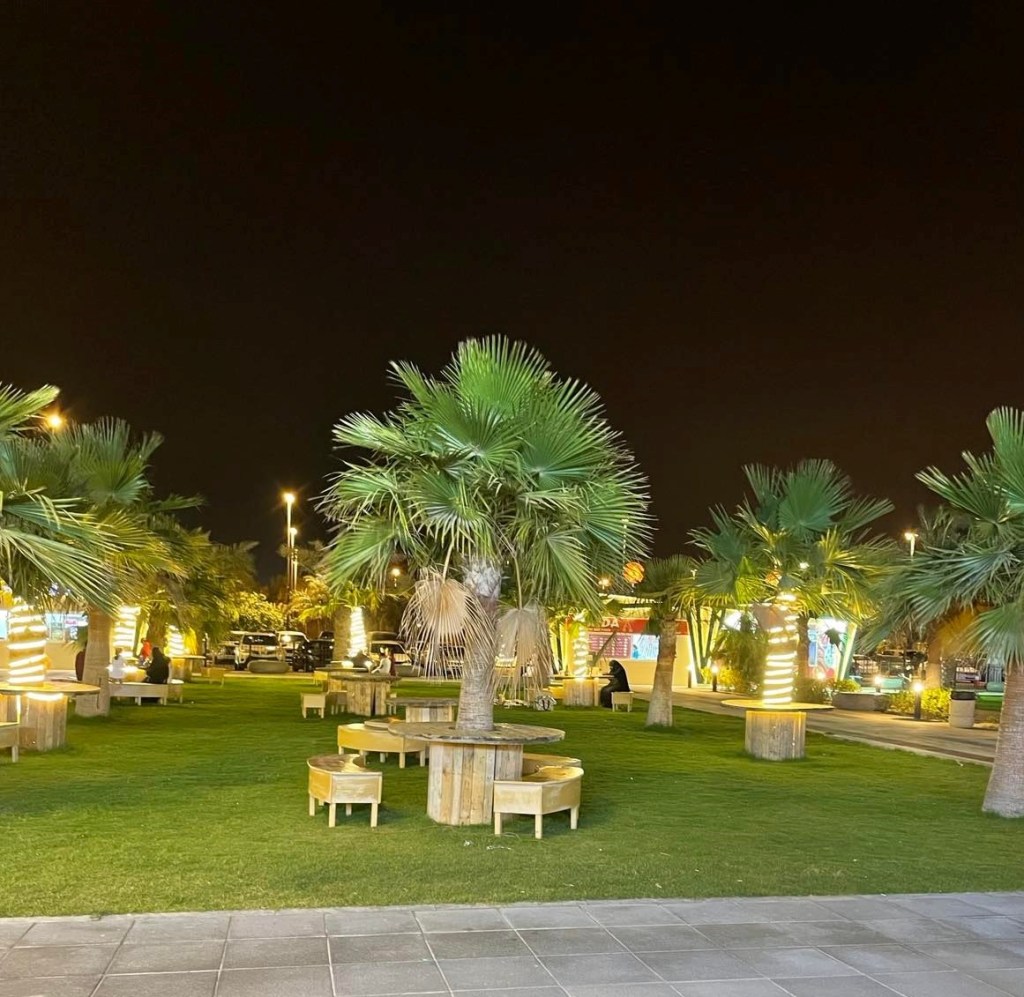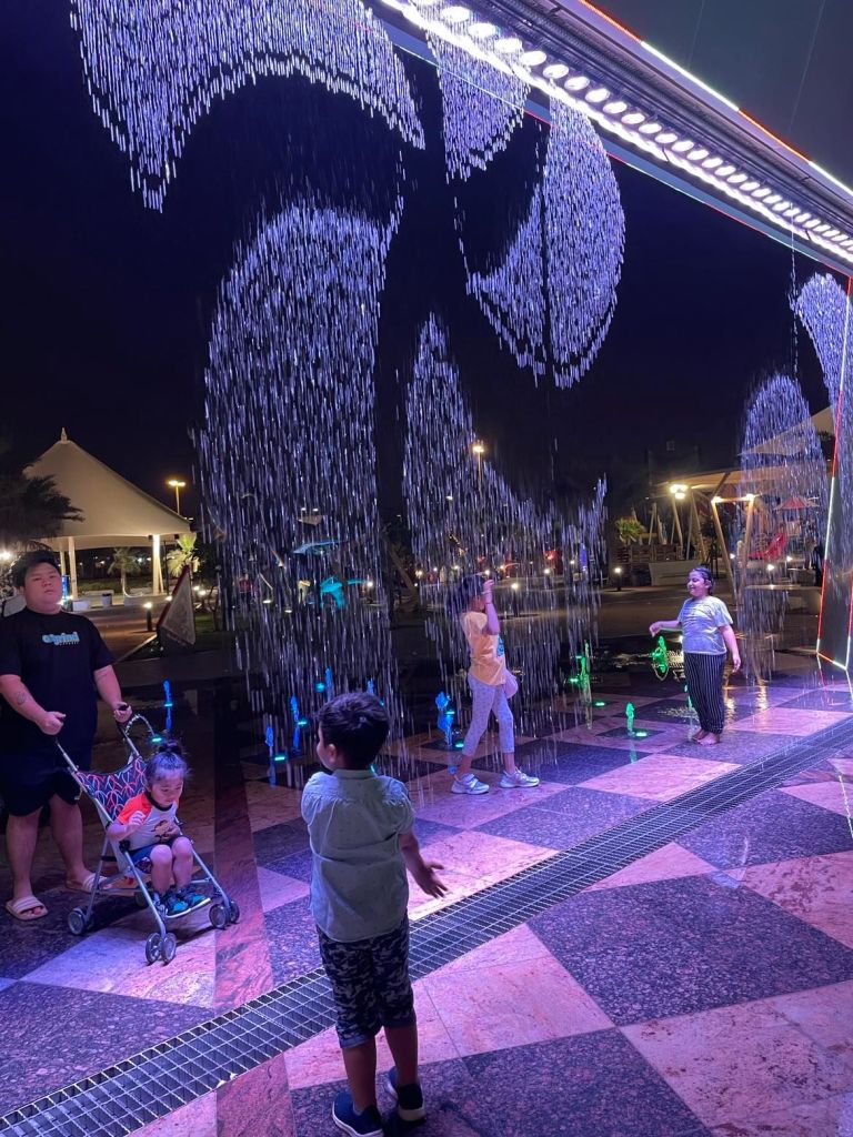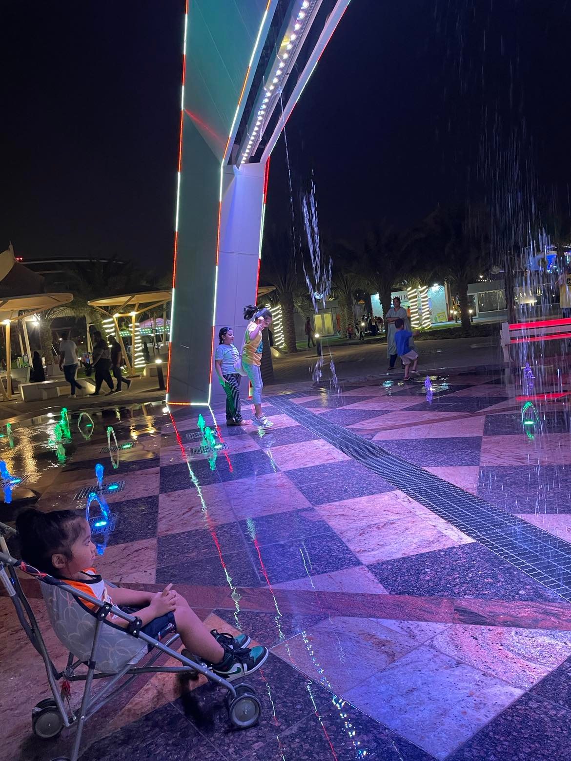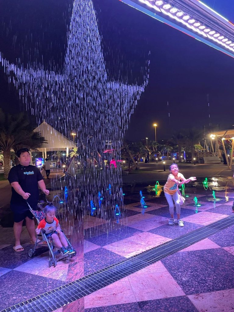 But then, you can just walk around, enjoy the free sight and let your kids play in the fountain- which I liked the most, with the word “Muharraq Garden” and some stars and other shapes made of water that attractively falls in the middle of the fountain that looks enticing to me while I sit on the luminous benches in different colors.