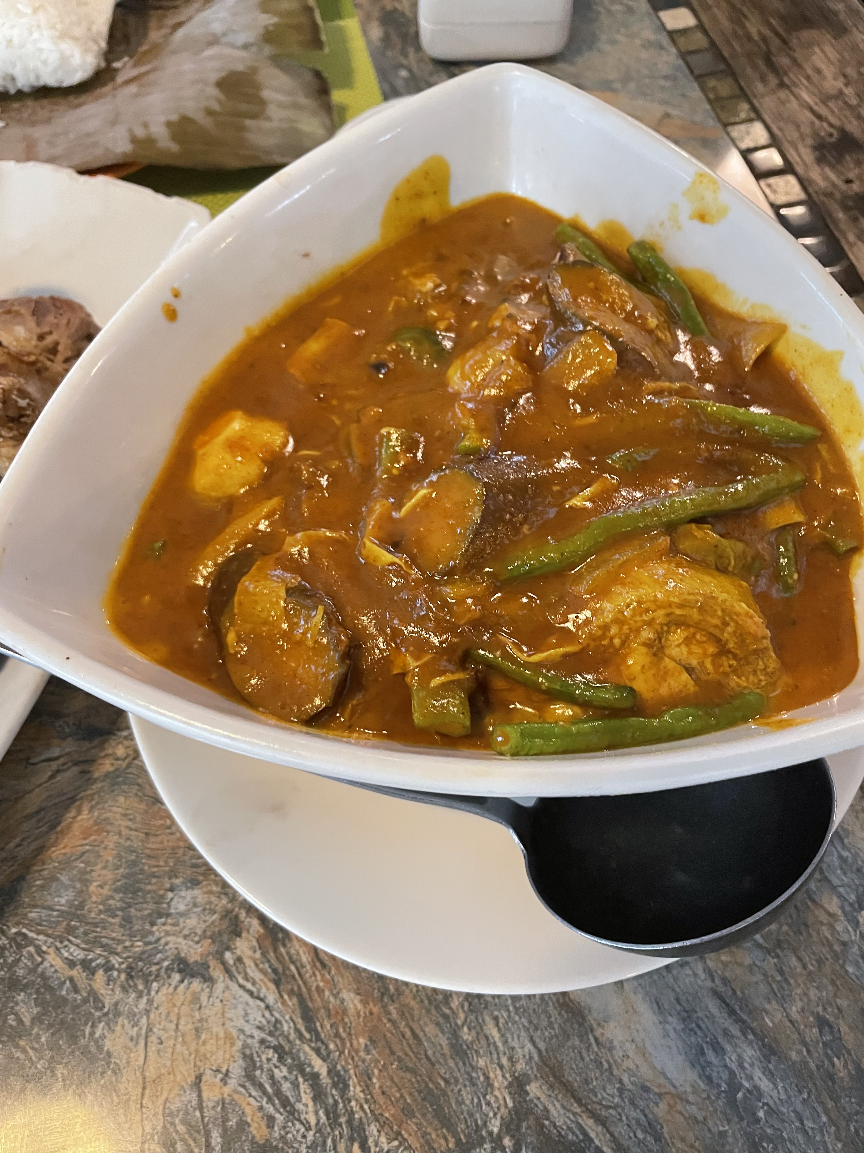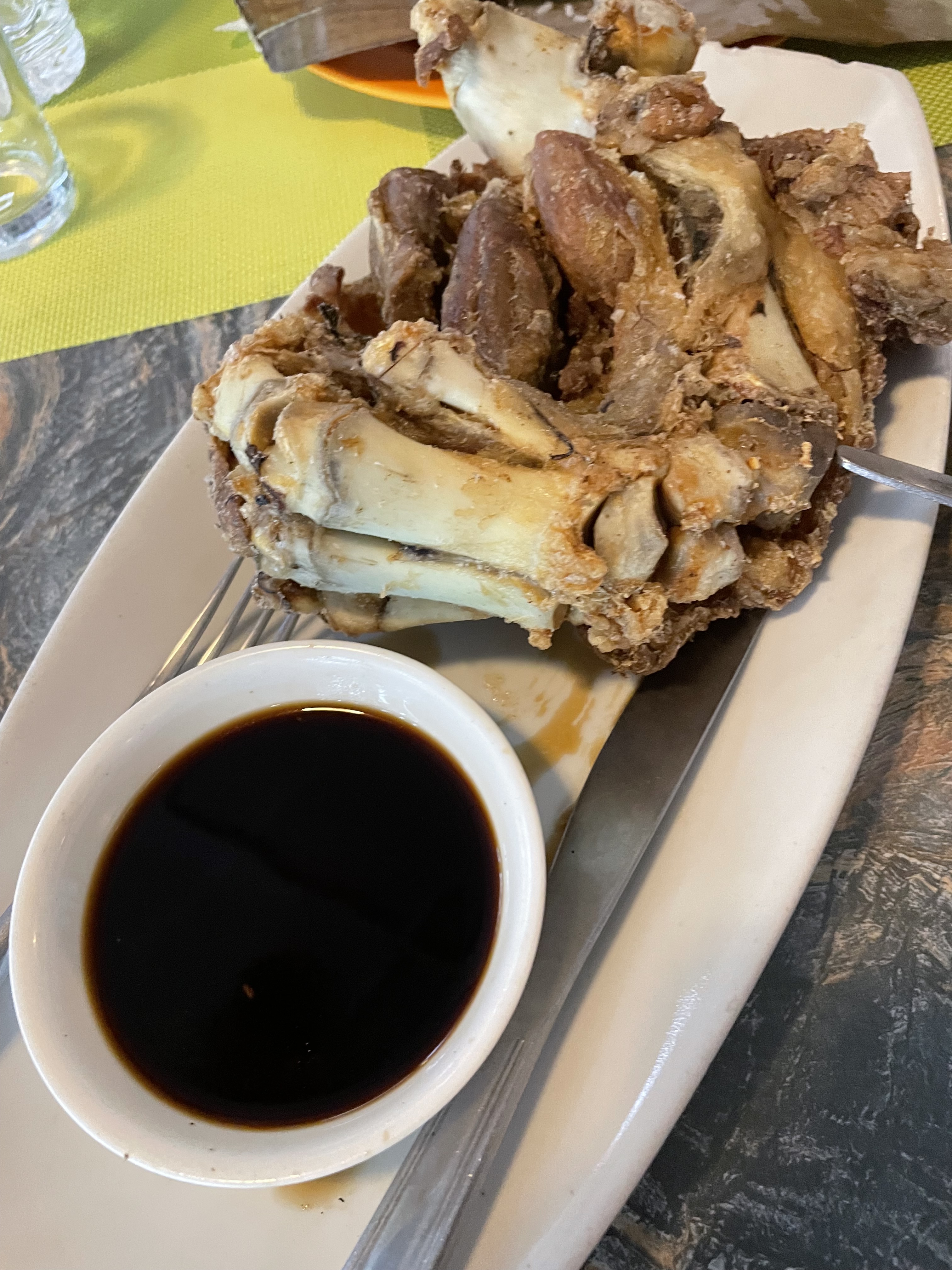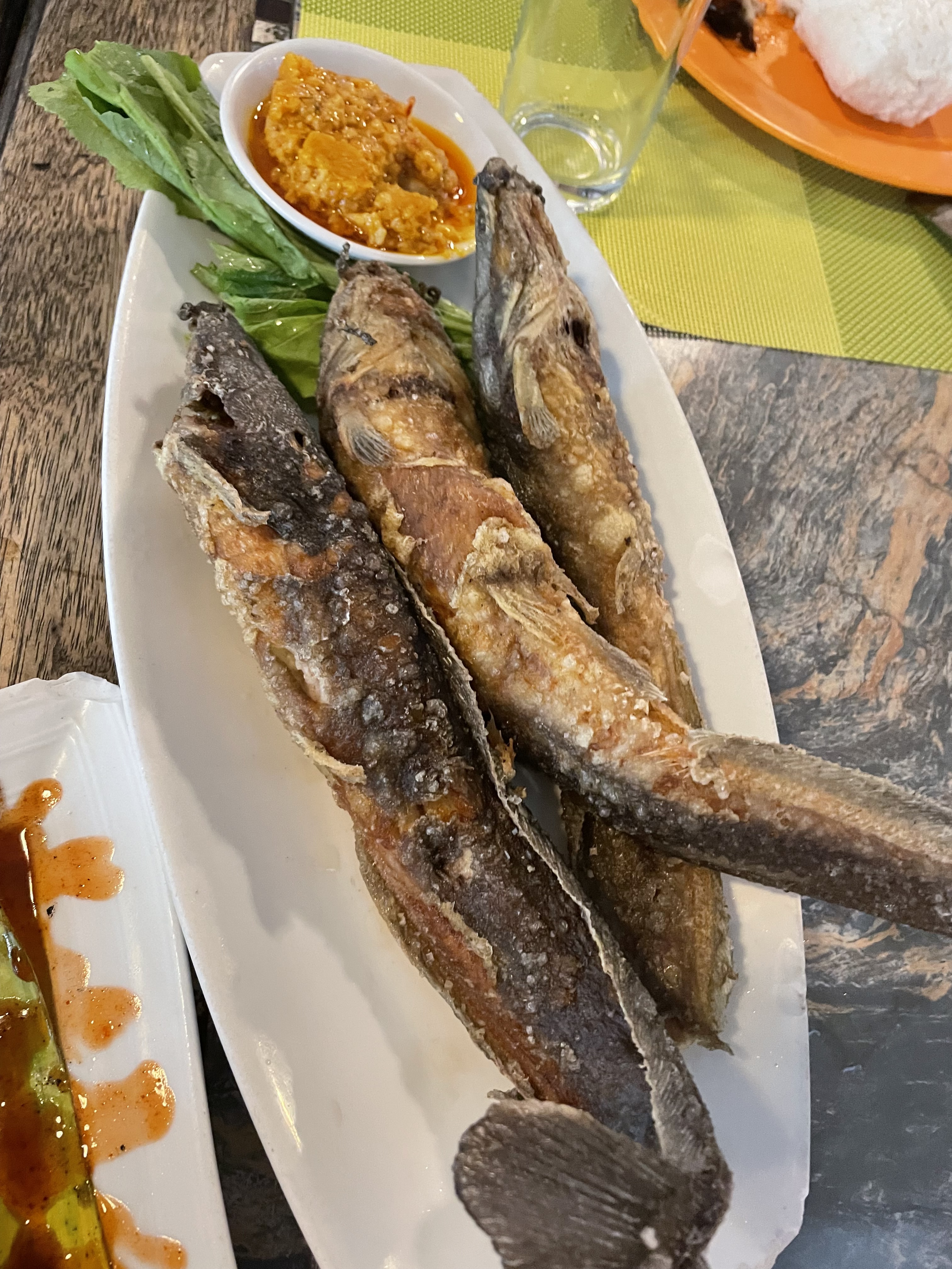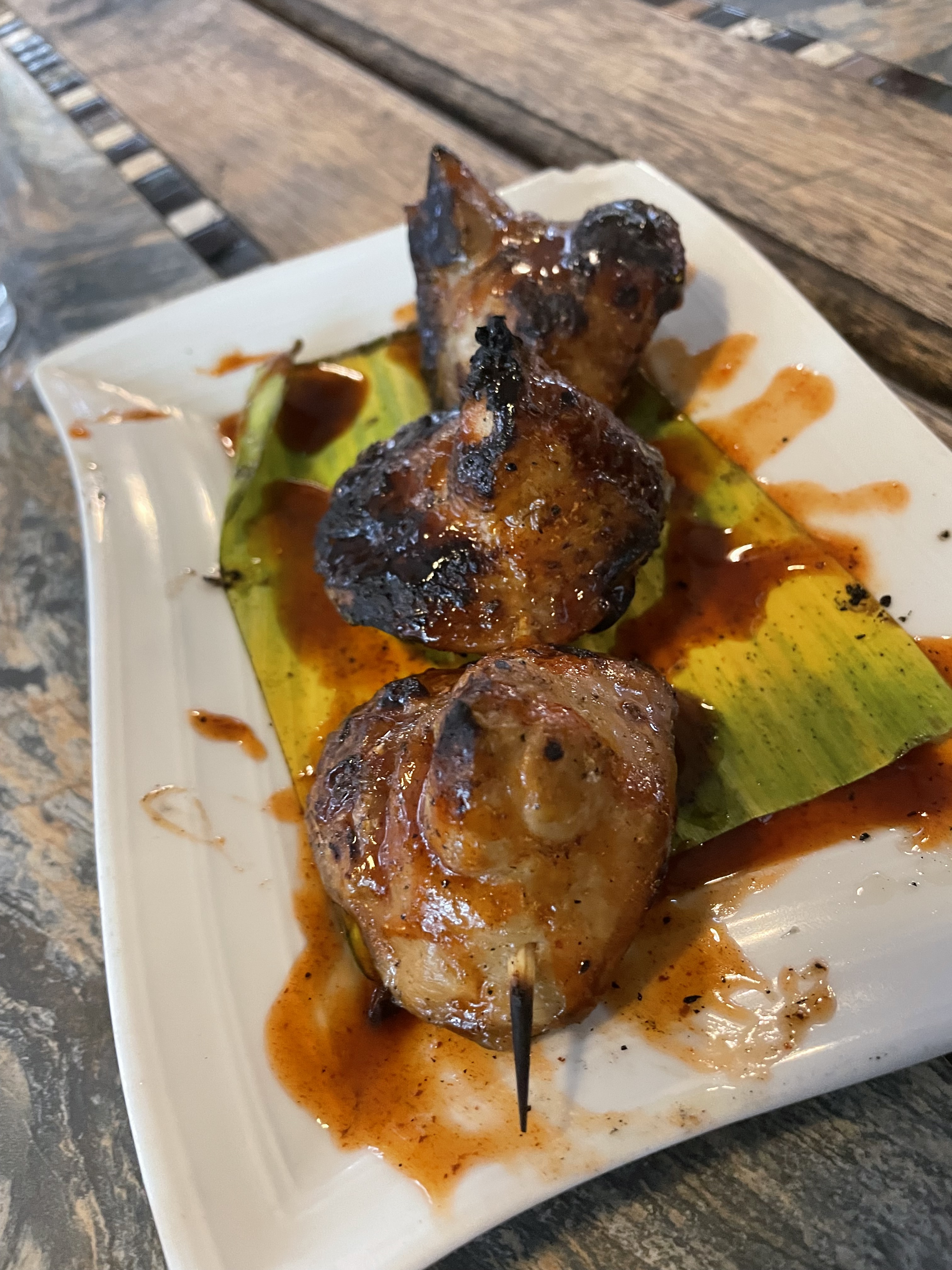 So we had grilled chicken ass and chicharon bulaklak for the starter. Kare kare, Crispy pata, and grilled fish with buro for the main meal.