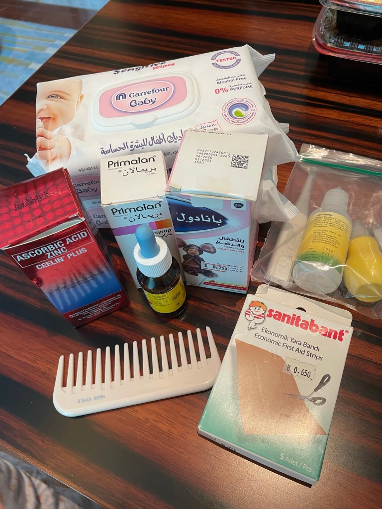 B. Vitamins, medicines like paracetamol and flu meds. I brought this specifically because these are the only meds that can make him feel better, 100%. I also pack the thermometer, the baby nail cutter, the saline, and the bulb in case he gets the flu. (I just hope this change of environment and weather will not make him sick, praying)