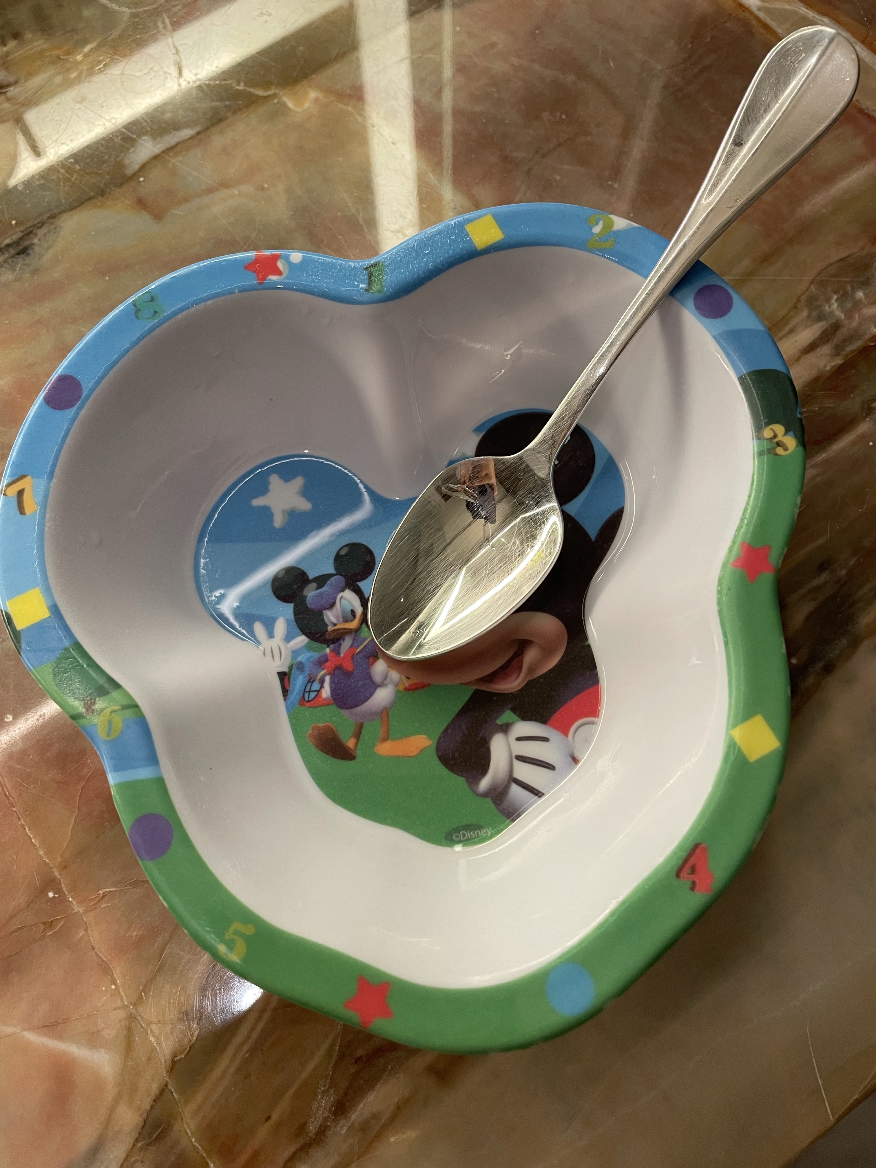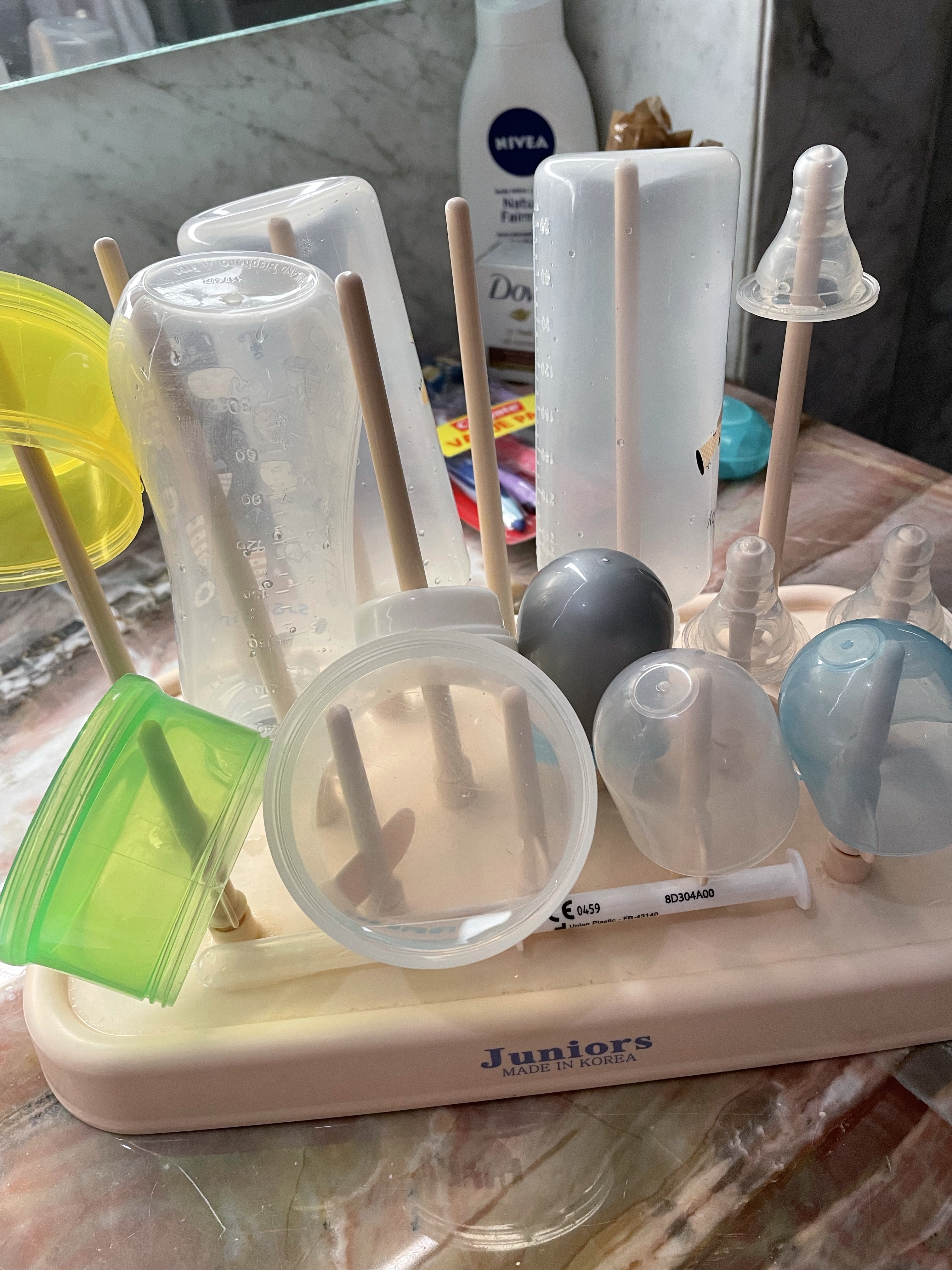 E. And things can’t live without. The ever-useful bottle rack ( yes, I have to tag it all along with us, the easiest way to dry the bottles not to have any water residue on it), the bottle cleaner & brush (not in the photo), and his food bowl.