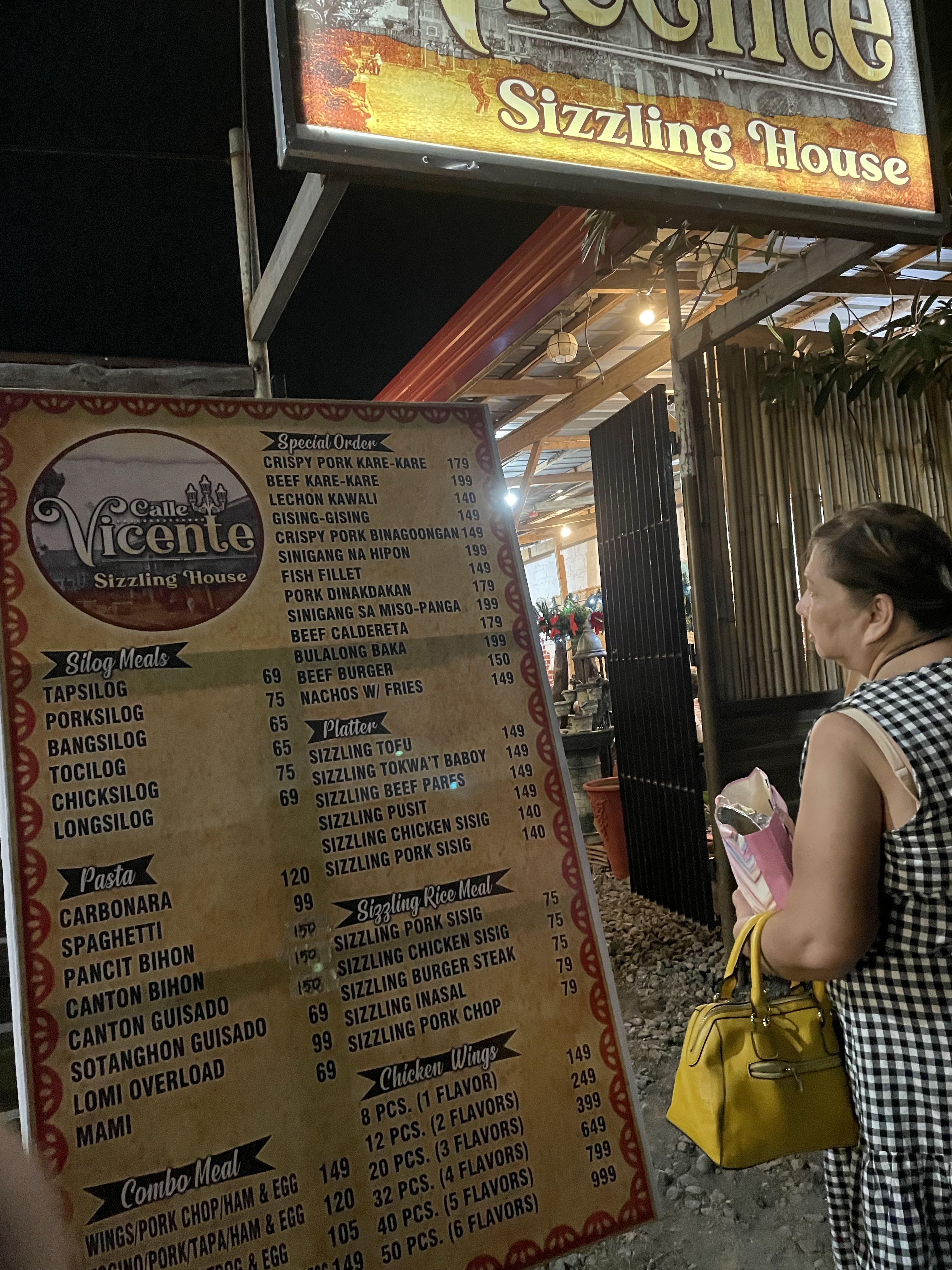 So, we just had a very quick dinner at the very first restaurant we passed by outside. It’s a small cute sizzling house just before the entrance and the ambiance is good, the place is tidy and it’s very cute to see that you get to sit on a wooden table and benches and the flooring is pure stones but unfortunately, the service is very bad, and the food is quite as bad as the service- which is totally in contrast with the very lovely atmosphere. But since we had no choice, and it was getting late, we waited for more than an hour for the food, and they served very cold rice, the binagoongan meal with just a bowl full of bagoong (a Filipino food- paste made of salted or fermented fish used as a condiment) on it and about 5 pieces of meat. The extra order takes another year to come, not to mention that if we didn’t follow up on the order, it will take probably another 5 years to come as the waitress forgot our order (they do not even carry a paper and pen for taking the orders and they only rely on their memory skills to remember all the orders).